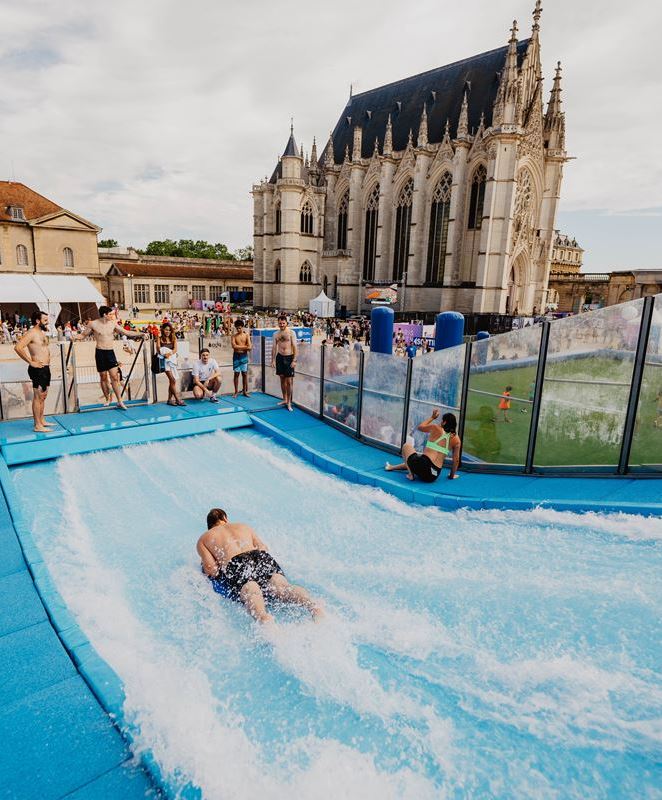 During the summer of 2024, the historic Château de Vincennes was transformed into a Fan Zone for the Paris 2024 Olympic Games. This iconic site in eastern Paris became a place of excitement and cultural celebration, bringing the Olympic spirit to life for thousands of fans. Among the standout attractions was the Mobile WaveSurfer on Trailer, a surf simulator set up in the Royal Courtyard. The WaveSurfer allowed visitors, from novice to expert surfers, to enjoy a flowboarding experience in a controlled and safe environment. This unique installation brought the Olympic discipline of surfing directly to the heart of Paris, giving fans a taste of the action without ever leaving the city.