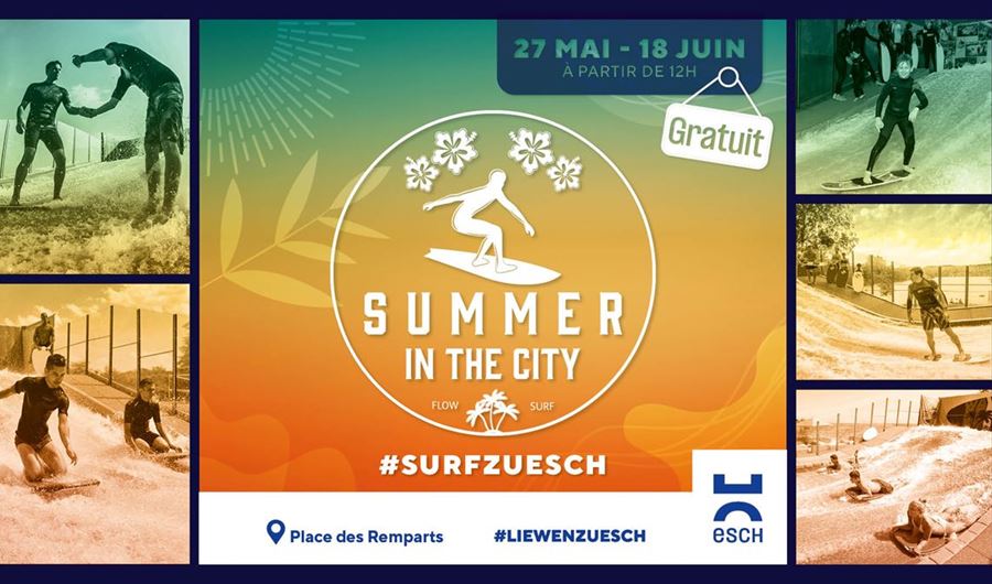 Depuis le 27 mai et jusqu'au 18 juin, un parfum d'Ibiza flotte à Esch. La Place des Remparts s'est métamorphosée en une plage urbaine où sable, chaise longue et bar à cocktails attendent les personnes en manque de vacances et où les amateurs de surf, jeunes et moins jeunes, peuvent s’essayer à dompter une vague artificielle.